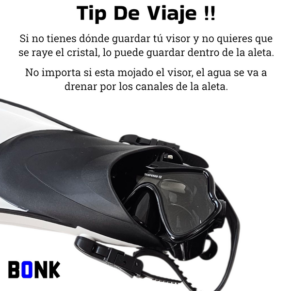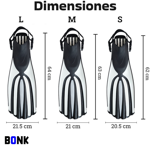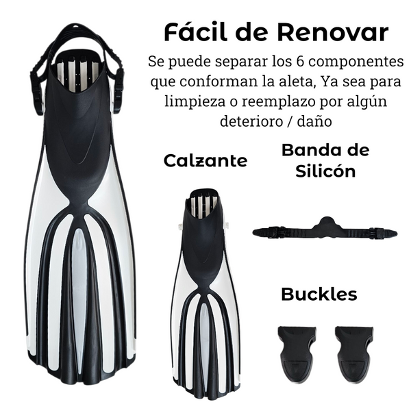 Ajusta tus aletas con facilidad mediante sus bandas elásticas y broches laterales, que aseguran un ajuste firme y cómodo junto con tus botas de buceo.