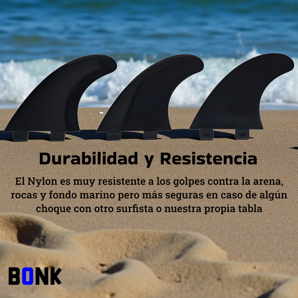 Fabricadas en nylon de alta resistencia, soportan el impacto de las olas sin deformarse. Su diseño equilibrado brinda un excelente agarre en giros y transiciones suaves, ideal tanto para principiantes como para surfistas experimentados.